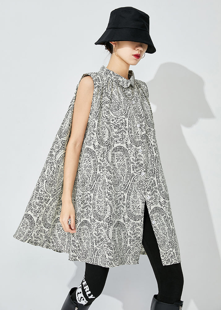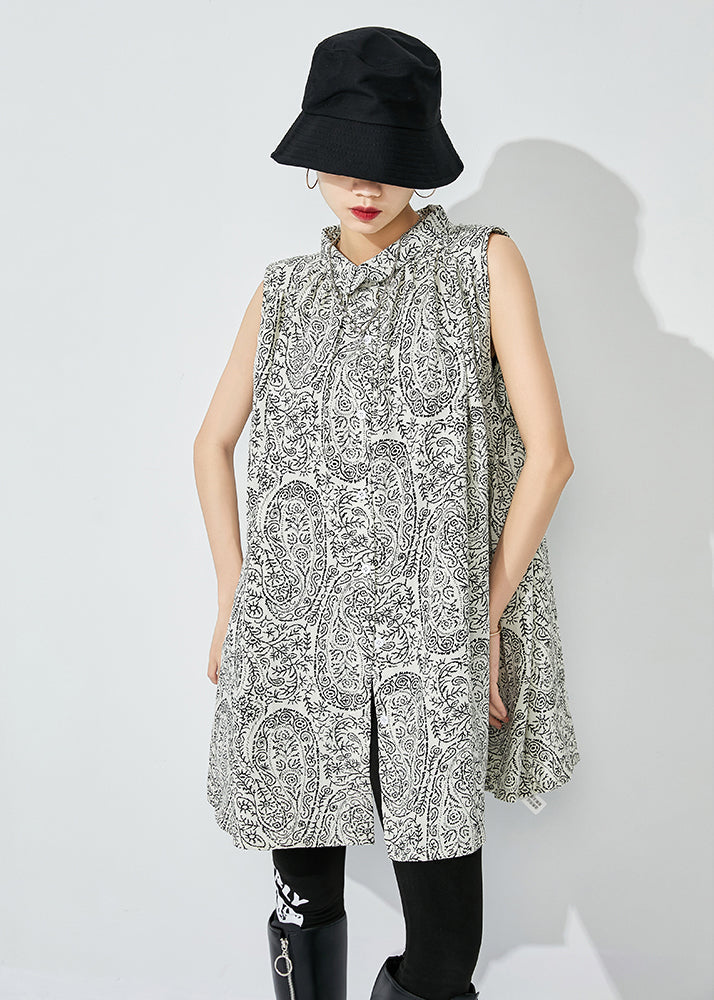 Plus Size White Stand Collar Print Cotton Shirts Sleeveless