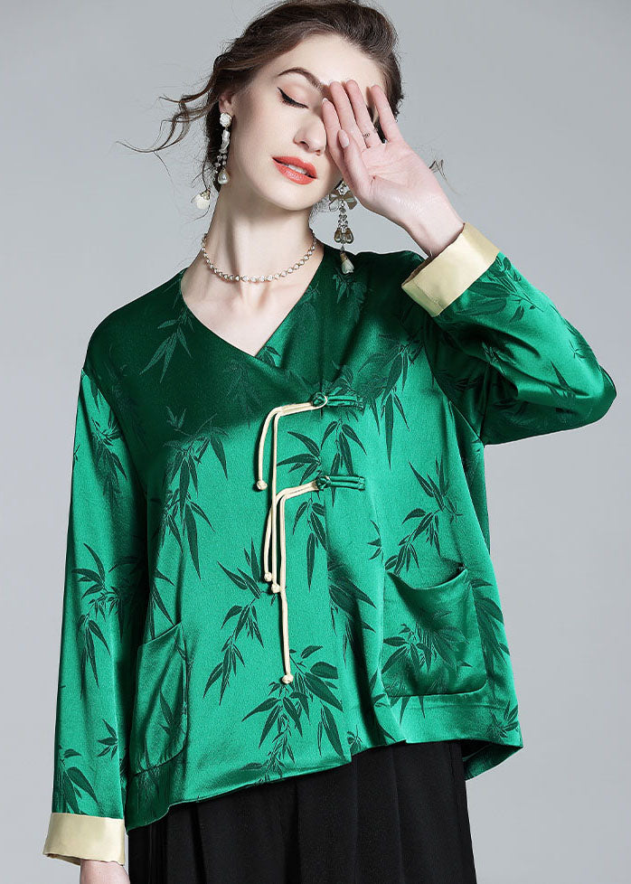 Art Green V Neck Tasseled Jacquard Patchwork Silk Tops Spring LY0115