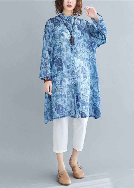 Beautiful Blue Stand Collar Oversized Print Linen Long Shirt Spring