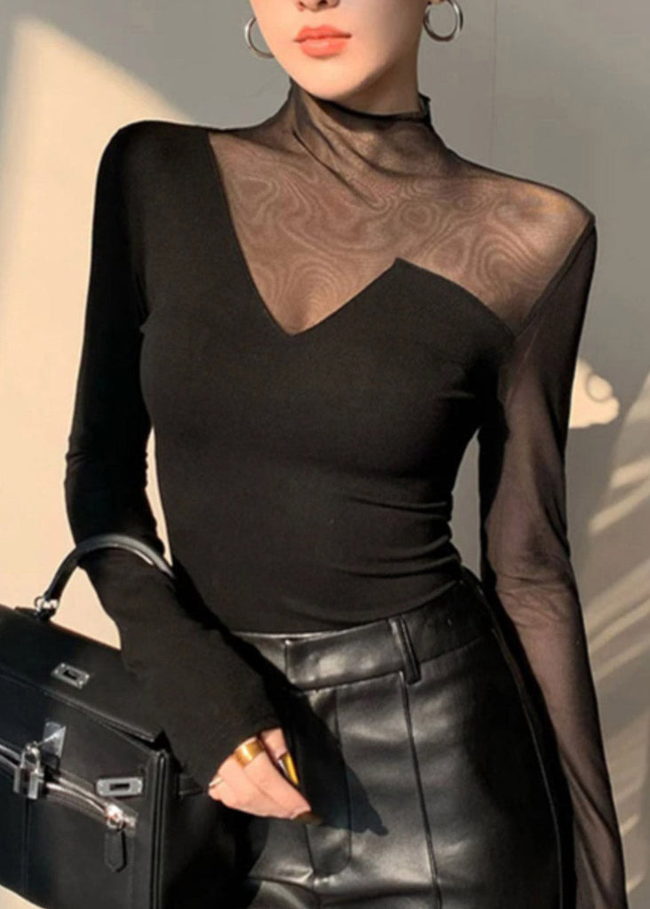 Club Black Turtleneck Patchwork Hollow Out Tulle Top Spring
