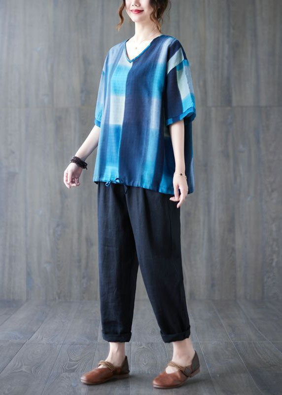 Blue Plaid Linen Tanks V Neck Drawstring Summer