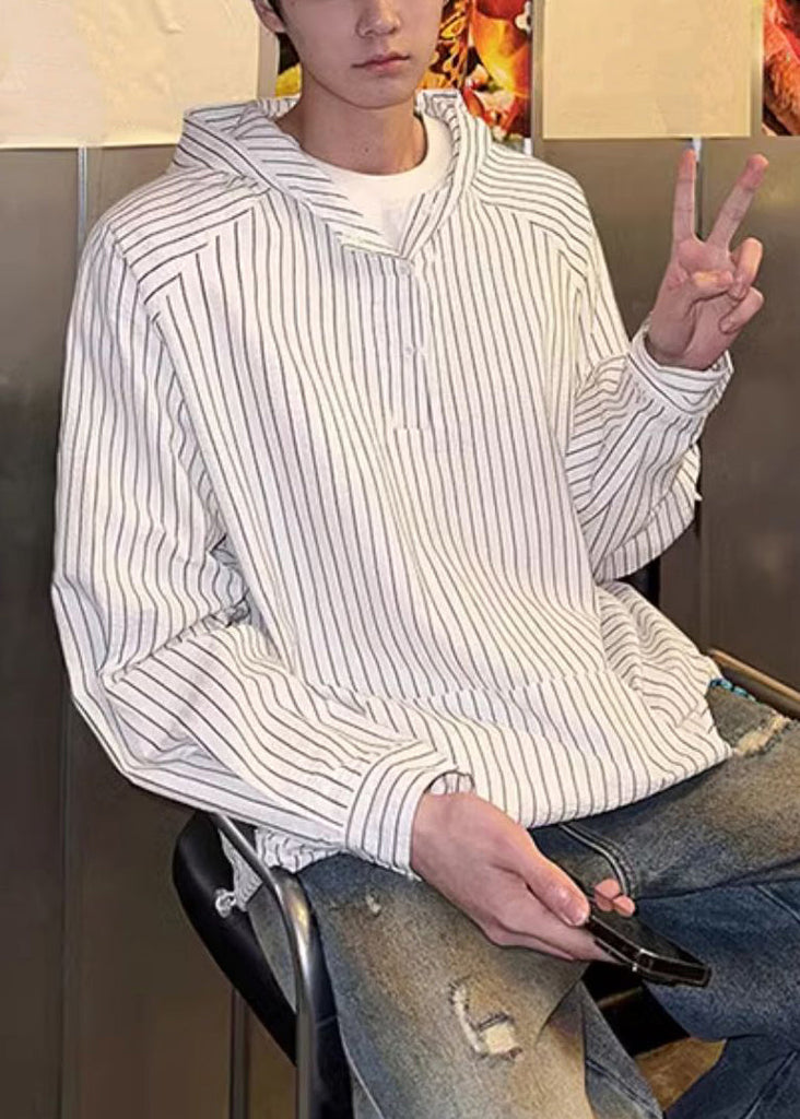 Button Vintage Shirts Spring Men's Striped Hooded Cotton Blue FashionChic