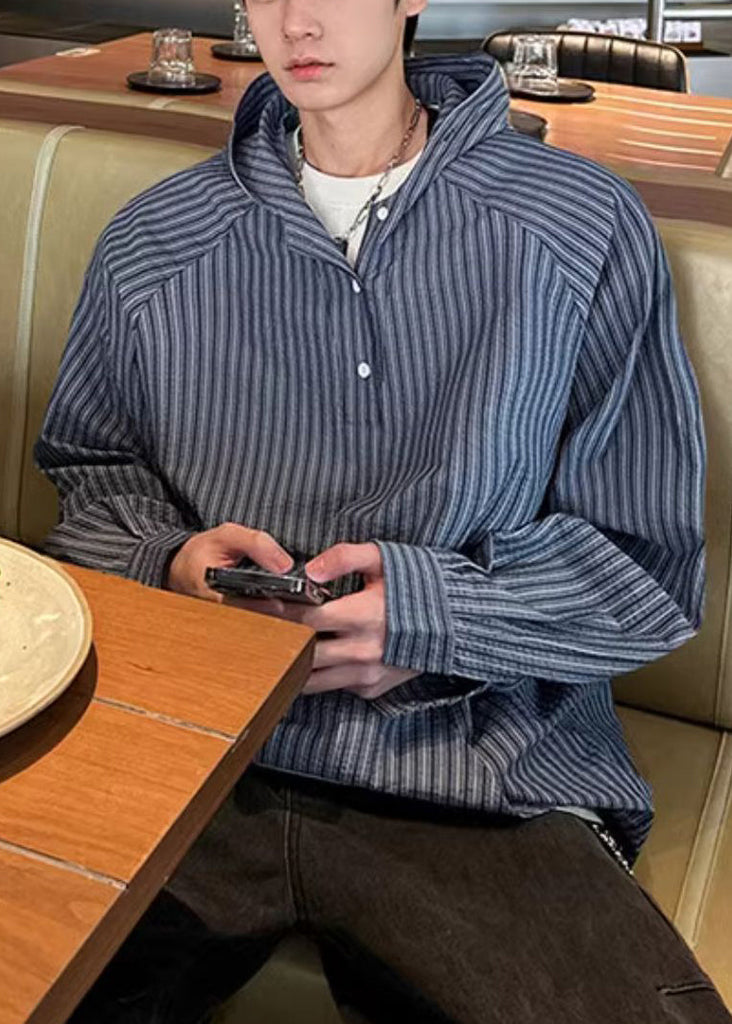 Vintage Blue Hooded Striped Button Cotton Men's Shirts Spring