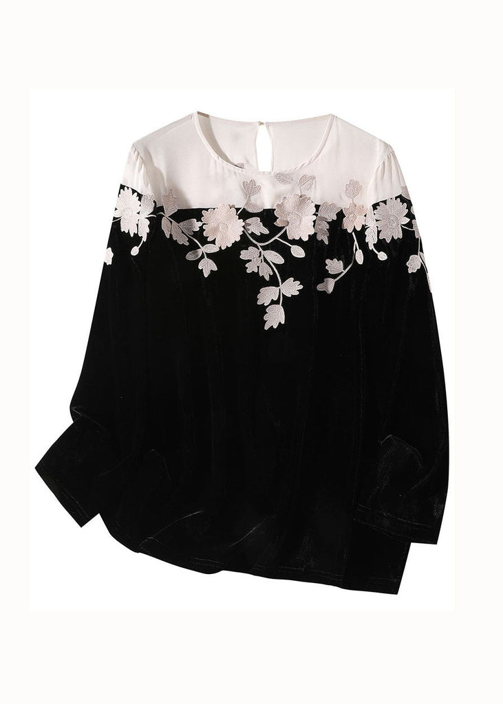 Casual Black Embroideried Patchwork Silk Velour T Shirt Spring LY0095
