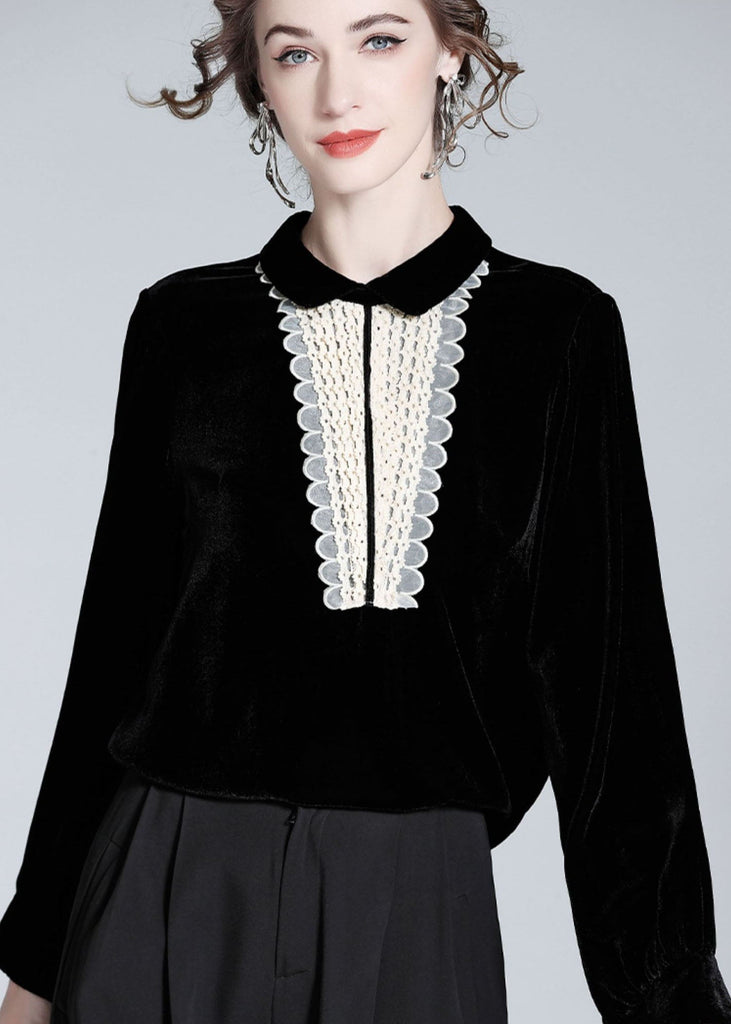 The Classy Black Peter Pan Collar Lace Patchwork Silk Velour Top Spring LY0994 is a sensational customer favorite, and we hope you like it just as much.