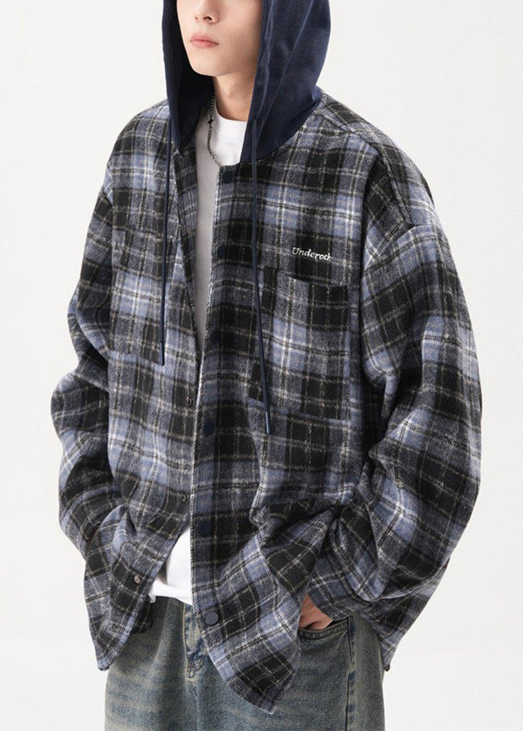 French Blue Hooded Plaid Button Cotton Mens Coats Spring