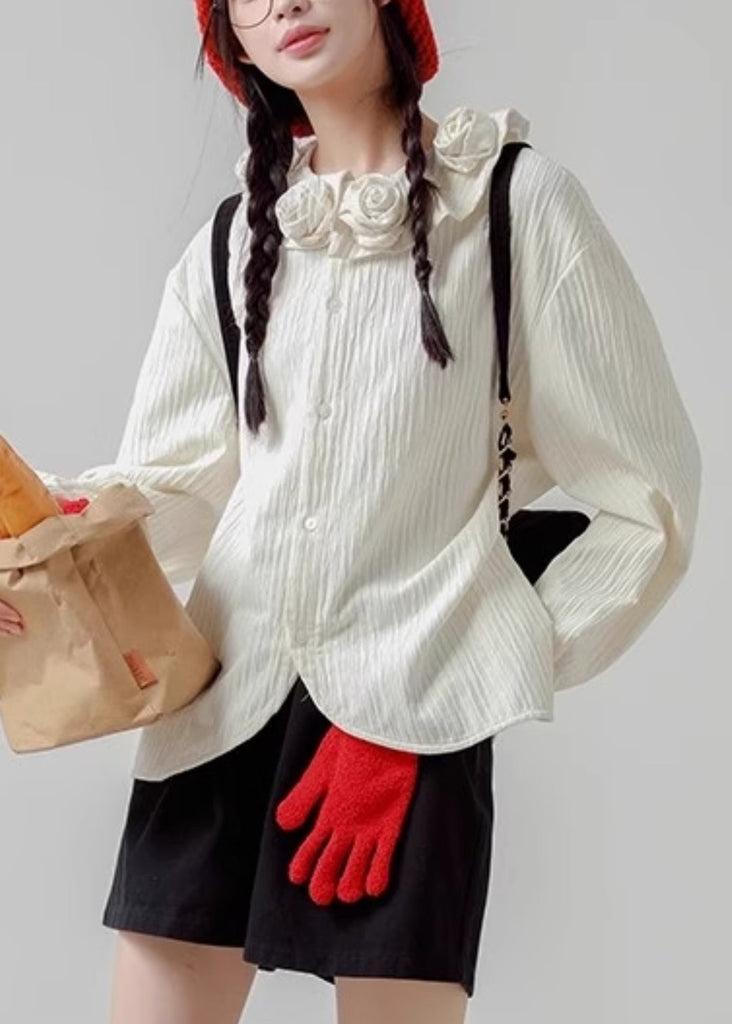 Cotton White Button Spring Shirt Floral Loose FashionChic