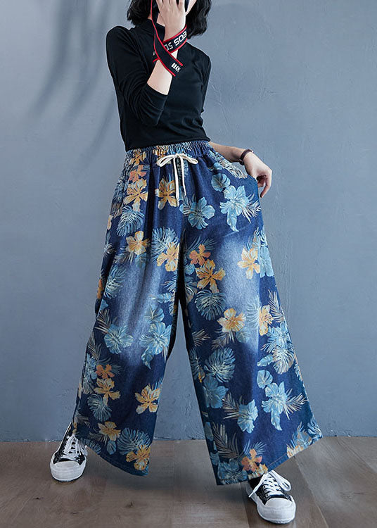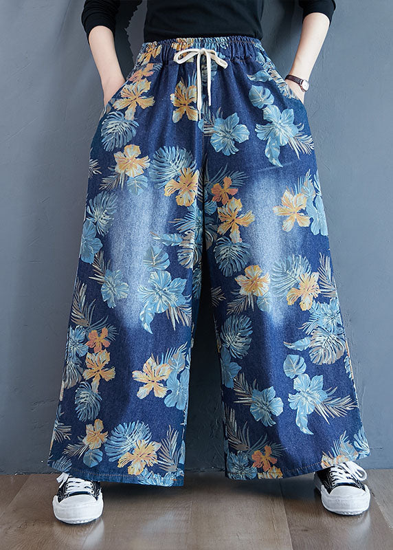 Denim Blue Print Cotton Wide Leg Pants Elastic Waist Spring