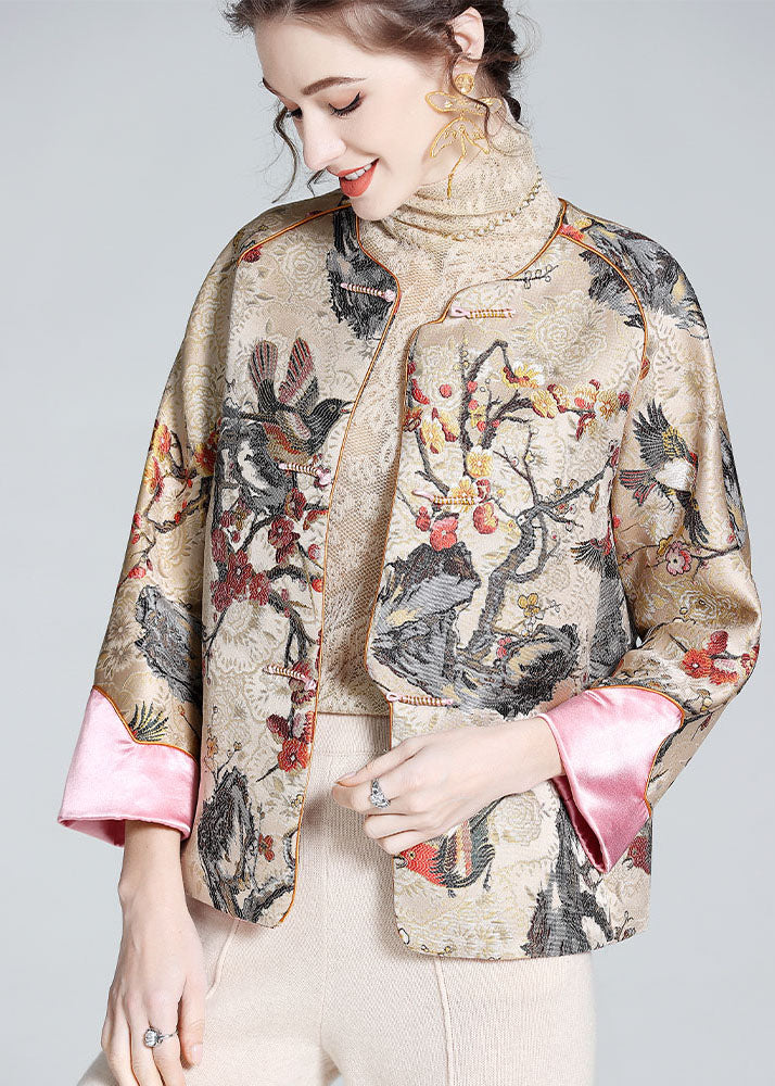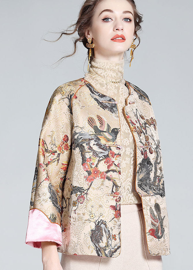 DIY Apricot O-Neck Embroideried Patchwork Chinese Button Silk blended Coats Spring