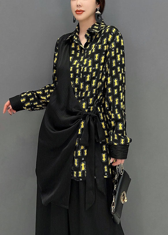 DIY Black Asymmetrical Patchwork Tie Waist Silk Two Pieces Set Spring