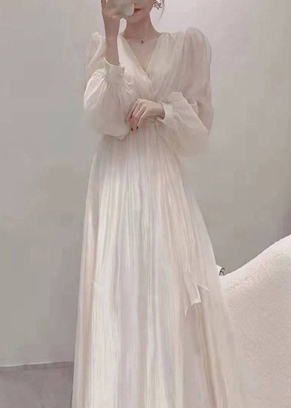 Elegant Apricot V Neck Tie Waist Chiffon Long Dress Spring