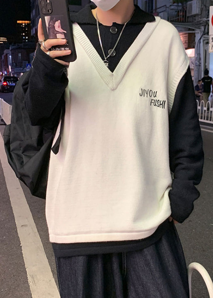 Art Beige Embroideried Cozy Patchwork Knit Men Sweater Spring
