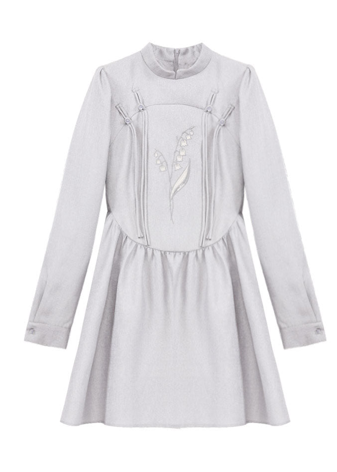 Fashion Grey Stand Collar Tasseled Embroideried Patchwork Silk Dress Spring LY0787