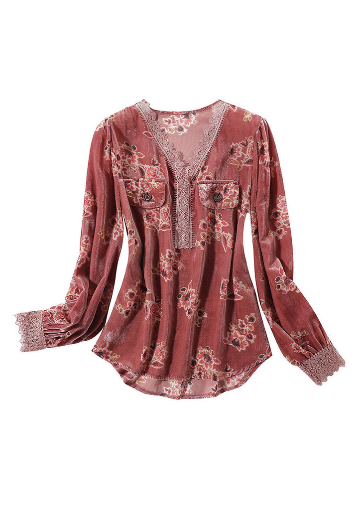 Fashion Red V Neck Print Lace Patchwork Silk Velour Top Spring LY0716