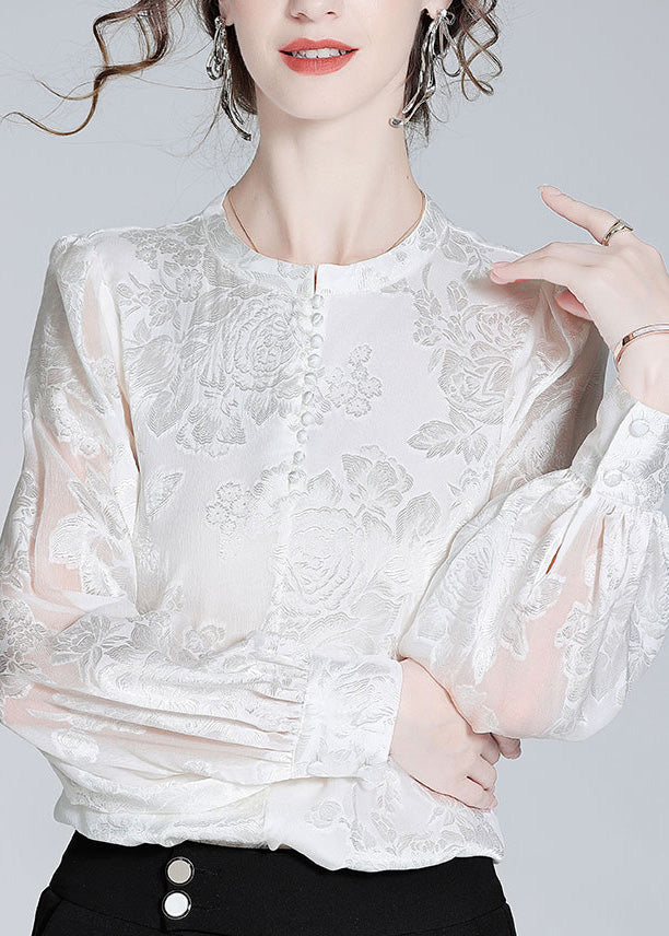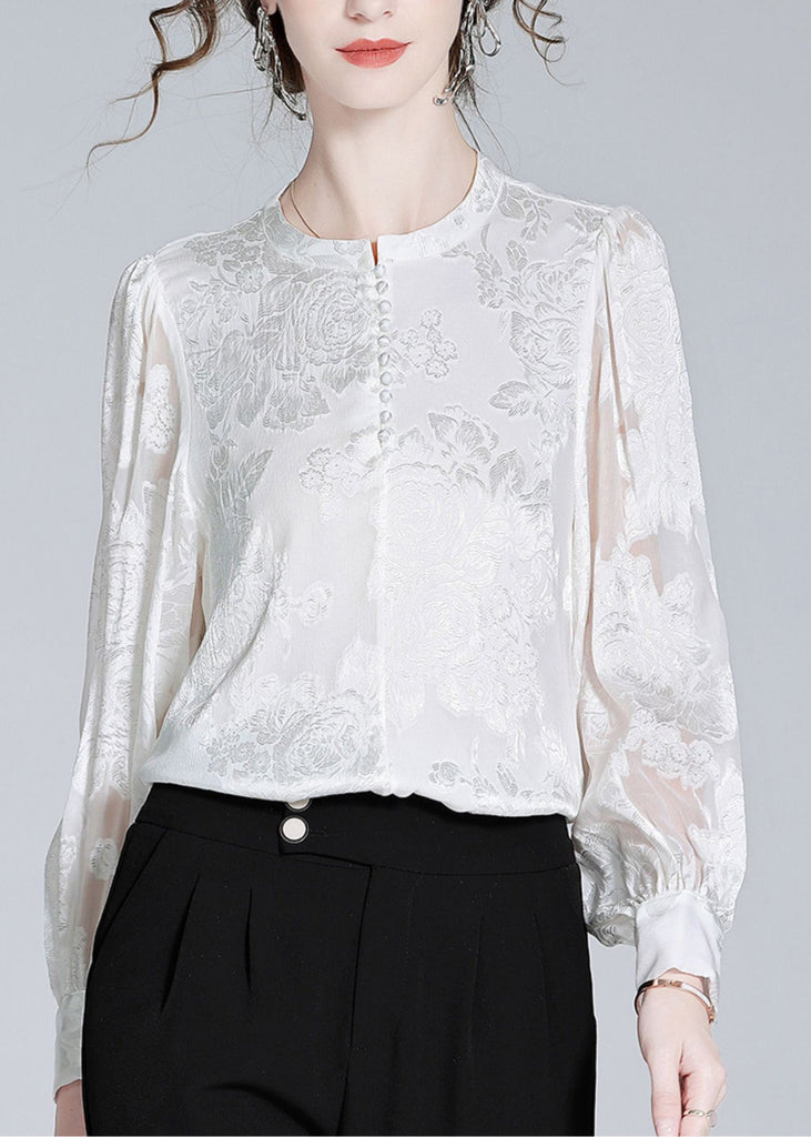 Fashion White O-Neck Button Jacquard Slik Shirt Spring