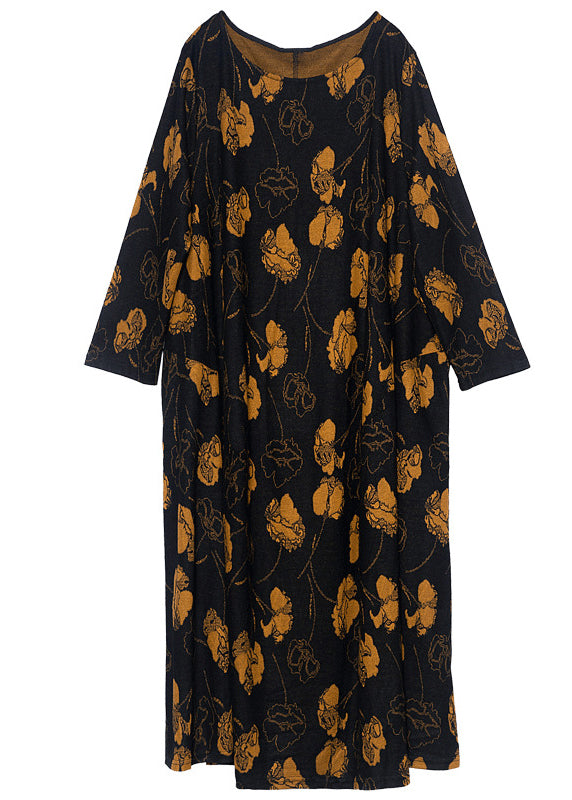 Fine Black O-Neck Oversized Print Cashmere Dresses Spring