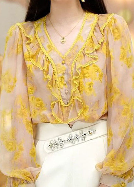 Fine Yellow V Neck Ruffled Print Chiffon Top Spring