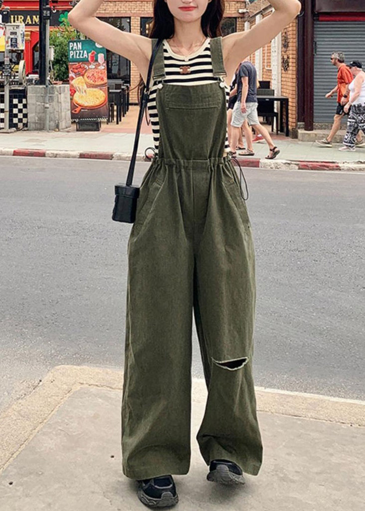 French Army Green Drawstring Pockets Cotton Jumpsuit Sleeveless XX028