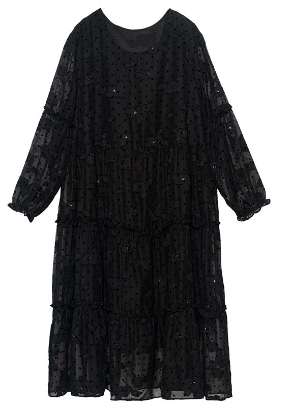French Black Embroideried Ruffled Hollow Out Chiffon Dresses Spring