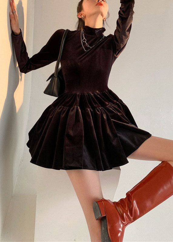 French Black Hign Neck Wrinkled Patchwork Silk Velour Dress Spring