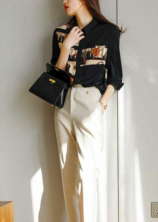 French Black Peter Pan Collar Print Chiffon Shirt Tops Spring
