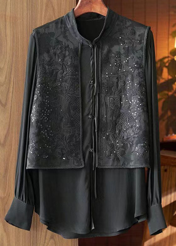 French Black Stand Collar Embroideried Patchwork Silk Blouses Spring