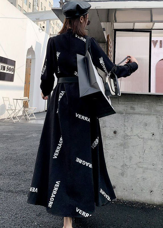 French Black Stand Collar Letter Print Exra Large Hem Chiffon Ankle Dresses Spring