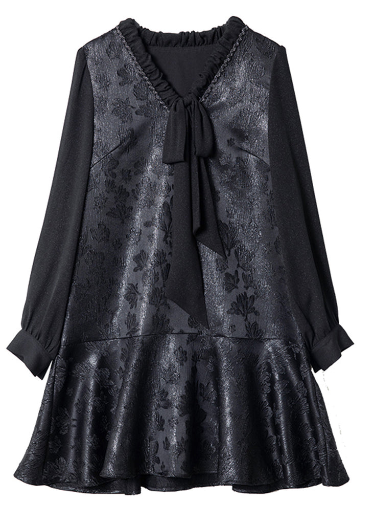 Elevate your style with the luxurious and exclusive French Black V Neck Ruffled Bow Silk Vacation Mid Dresses Spring from our latest collection. Crafted with delicate ruffled details and a sophisticated bow, this dress exudes elegance and grace. Perfect for your next spring vacation, it will elevate your wardrobe with a touch of artistry and allure.