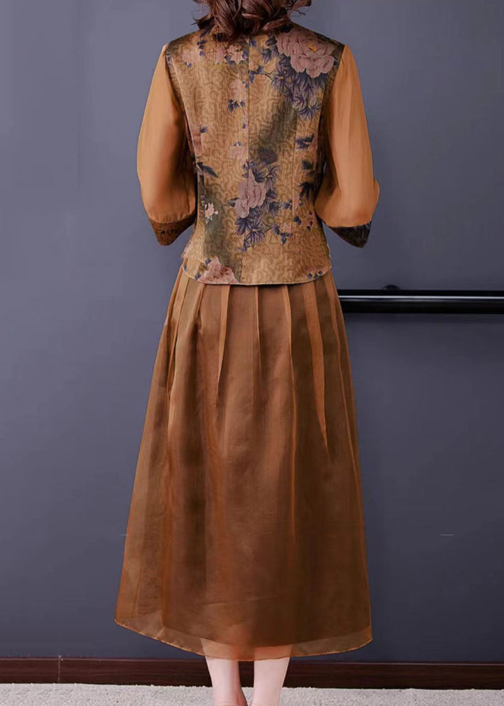 French Brown Peter Pan Collar Tasseled Print Patchwork Silk Two Pieces Set Spring