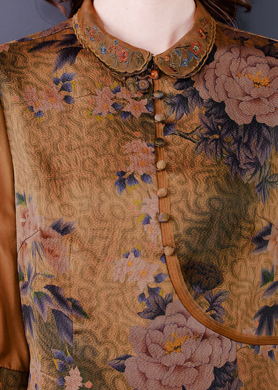 French Brown Peter Pan Collar Tasseled Print Patchwork Silk Two Pieces Set Spring LC0272