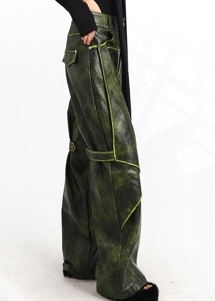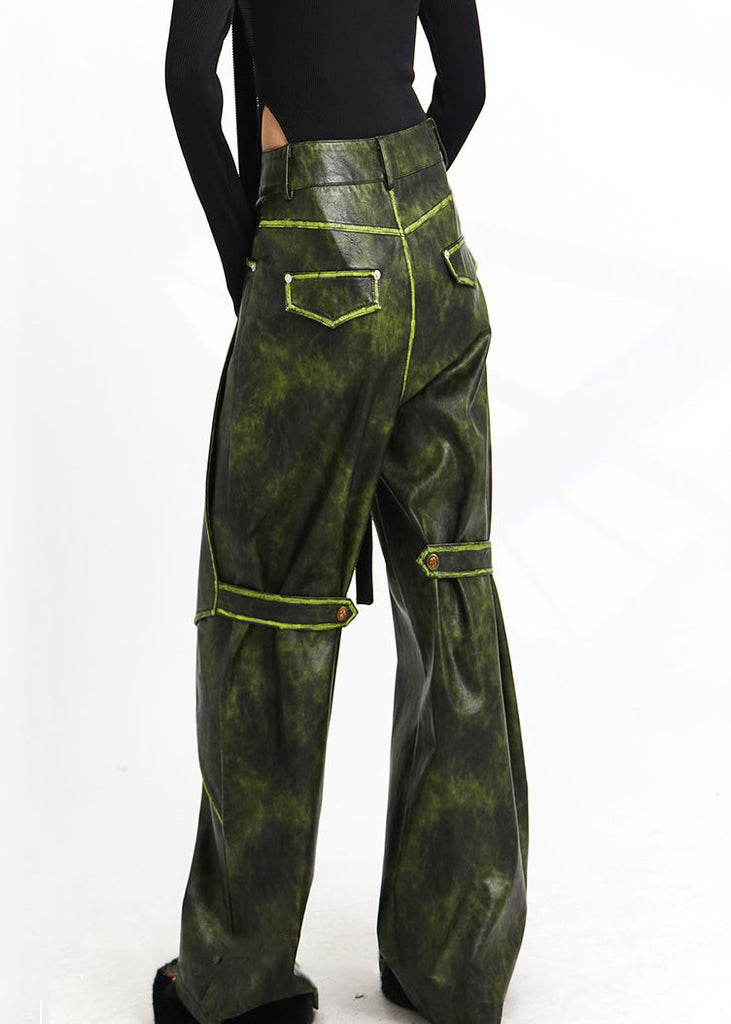 French Green Pockets High Waist Faux Leather Pants Spring AS1011
