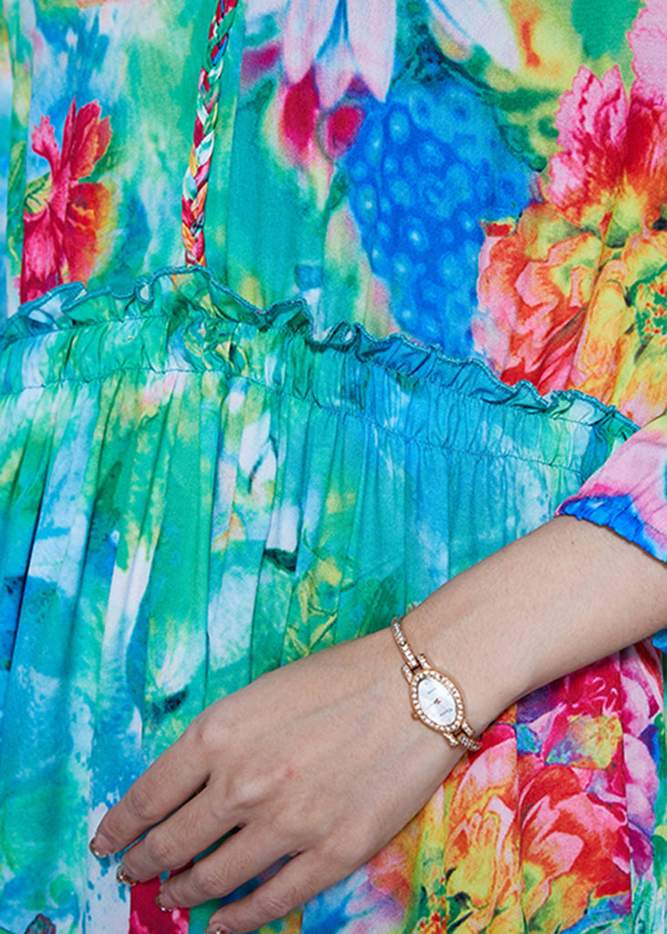 Indulge in the sophisticated elegance of our French Green Ruffled Print Extra Large Hem Silk Beach Dress for the perfect spring style statement.