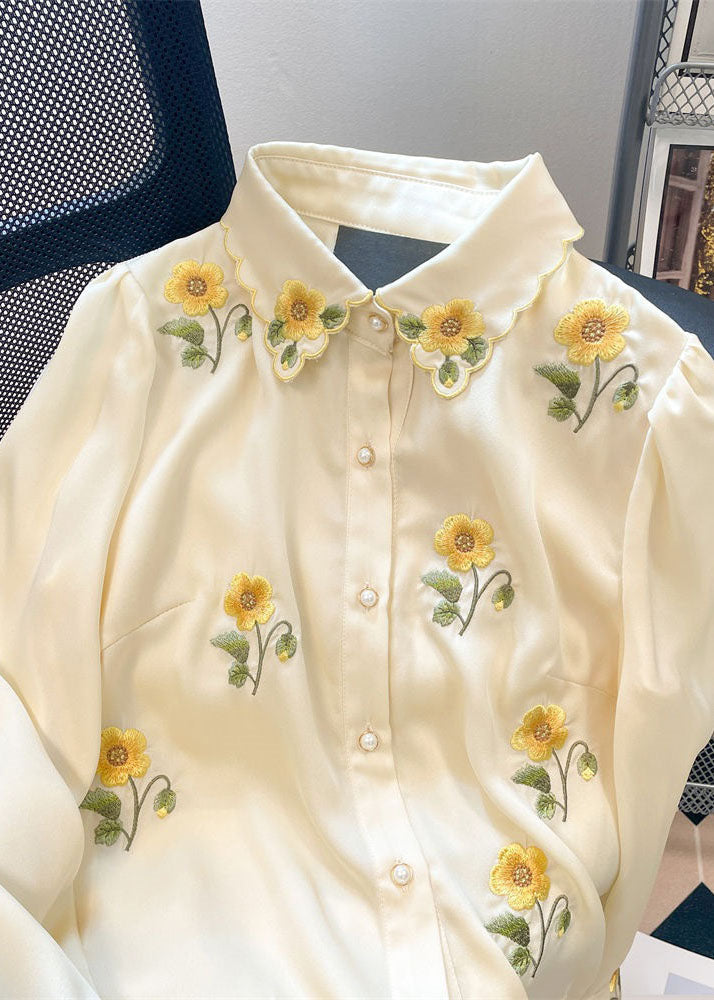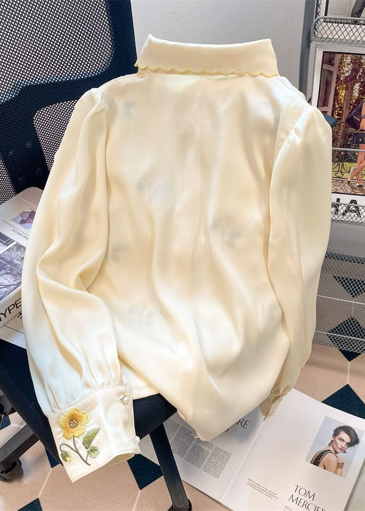 French Yellow Floral Embroideried Patchwork Silk Shirt Tops Spring