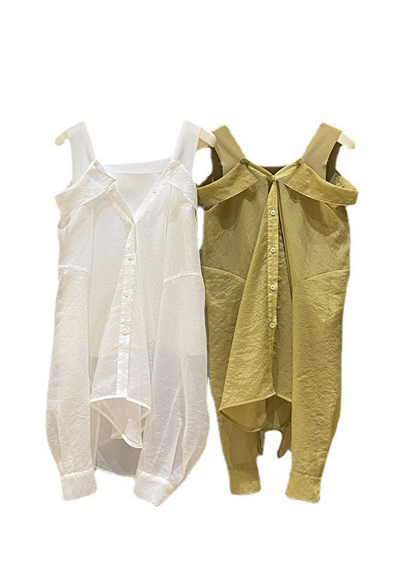 French Yellow Slash Neck Button Fake Two Pieces Silk Shirt Spring