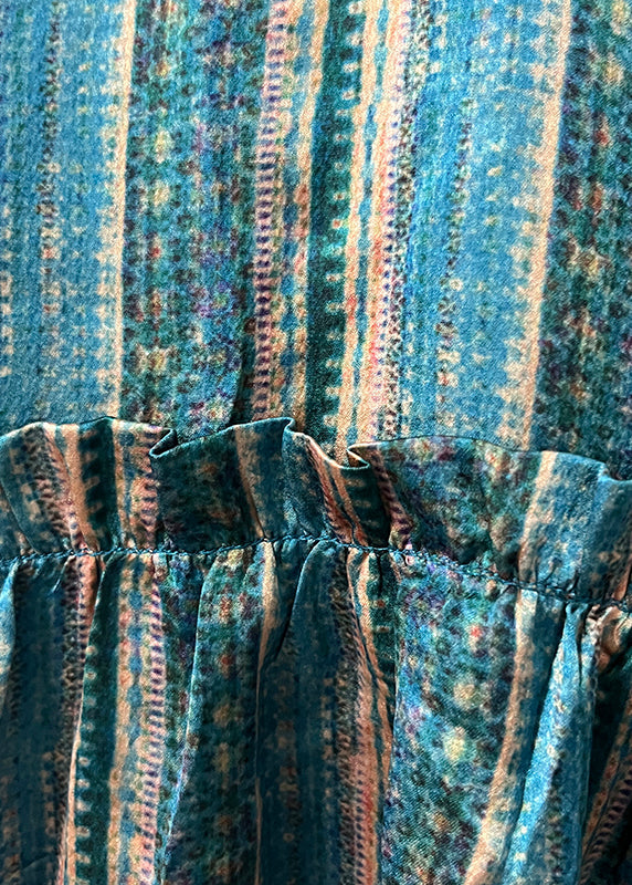 Green O-Neck Ruffled Wrinkled Silk Cotto Maxi Dress Spring VV040
