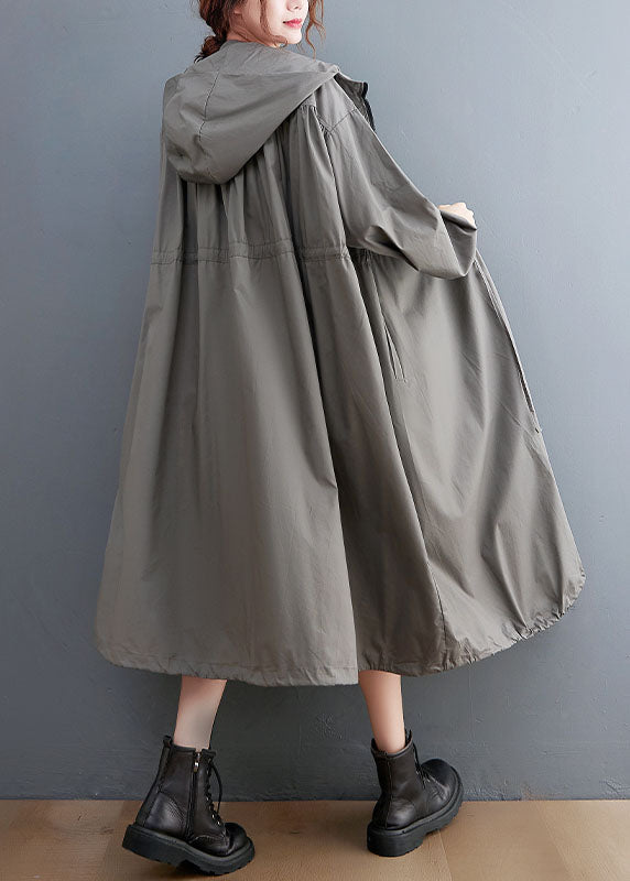Grey Oversized Cotton Trench Coat Hooded Drawstring Spring LY0657