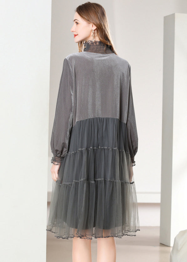 Grey Patchwork Silk Velour Holiday Dresses Oversized High Neck Spring LY0268
