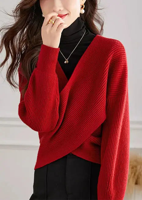 Handmade Red V Neck Cross Connection Knit Tops SpringFabric: Knit Blended