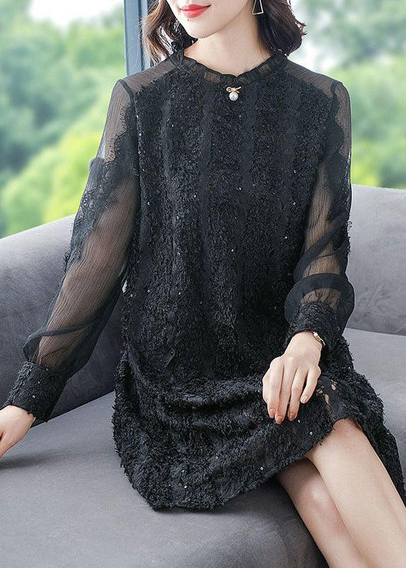 Italian Black O-Neck Patchwork Silk Mid Dress Spring