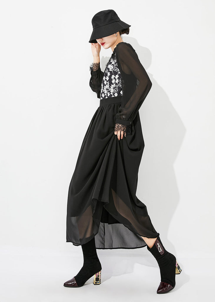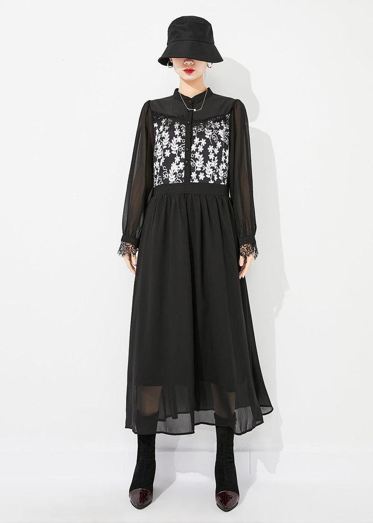 Italian Black Stand Collar Patchwork Exra Large Hem Chiffon Vacation Dresses Spring LY0885