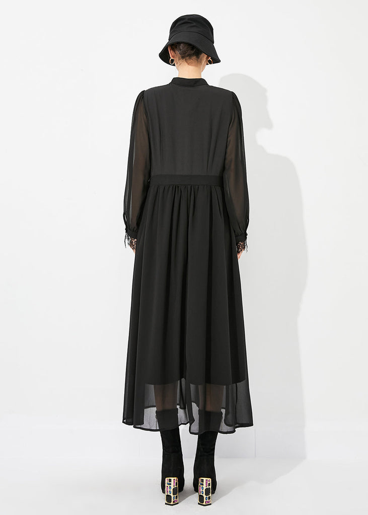 Italian Black Stand Collar Patchwork Exra Large Hem Chiffon Vacation Dresses Spring