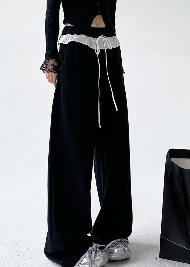 Loose Black Patchwork Tie Waist Straight Pants Spring TA064