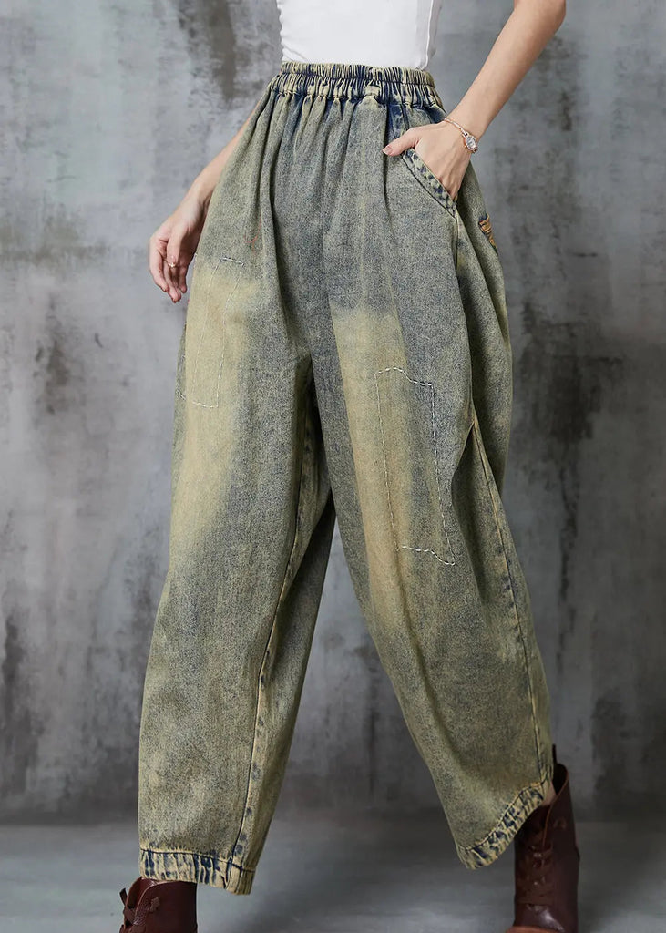 Loose Blue Elastic Waist Patchwork Applique Denim Pants Spring F4192