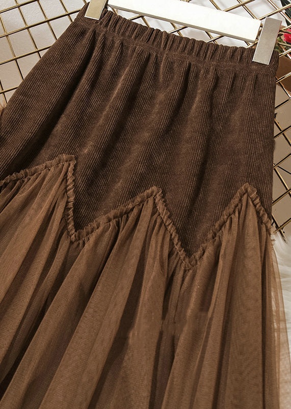 Loose Coffee Ruffled Elastic Waist Patchwork Tulle Skirts Spring AS1054