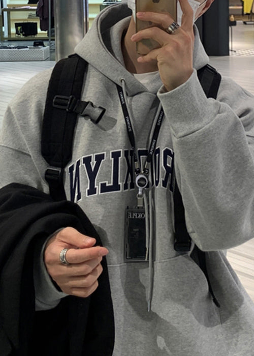 Loose Grey Letter Pockets Warm Fleece Men Sweatshirts Spring YQ025