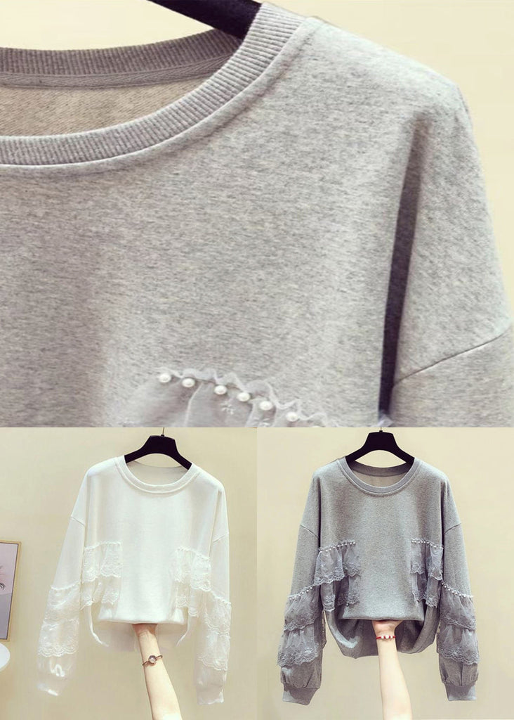 Loose Grey Pearl Lace Patchwork Cotton Streetwear Spring TD031