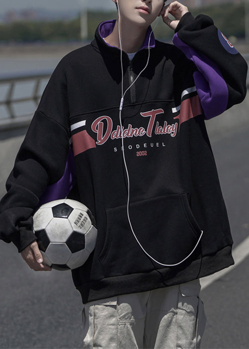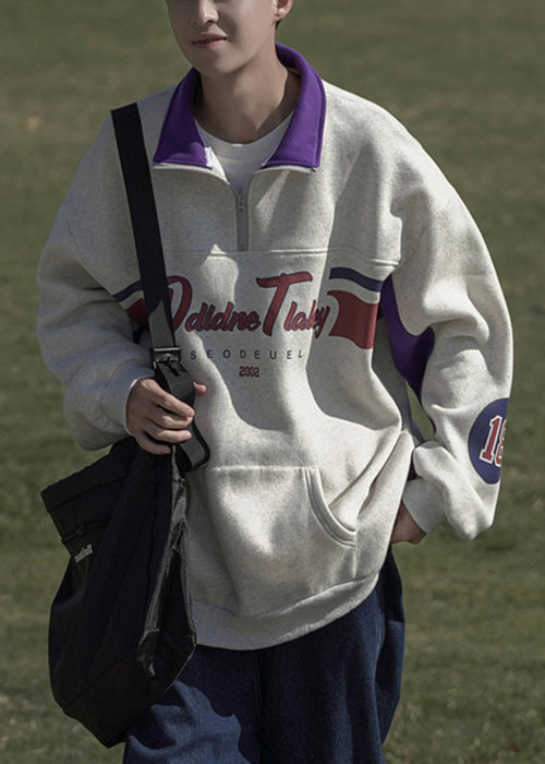 Loose Grey Zippered Print Pockets Cotton Men Sweatshirt Spring
