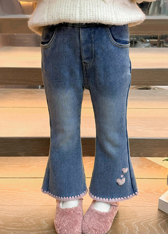 Modern Denim Blue Love Pockets Warm Fleece Girls Crop Flared Pants Spring TV004