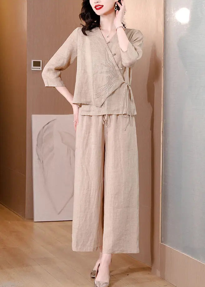 Plus Size Beige Asymmetrical Tie Waist Linen Two Pieces Set SpringFabric: Linen