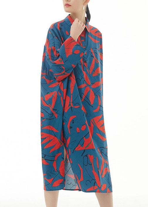 Plus Size Blue Peter Pan Collar Print Patchwork Cotton Shirts Dress Spring